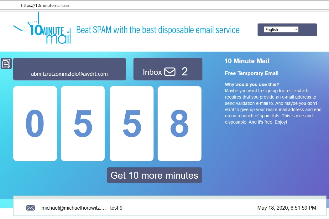 Ten Minute Mail offers a random email address that is good for only 10 minutes (but you can get another 10 minutes just by clicking a button). You are assigned the email address as soon as you visit the website home page. Received emails also show up on the website home page. You need do nothing, other than give out the email address. The service uses multiple rotating domain names. It is a free service with no ads and donations are accepted. See a screen shot.