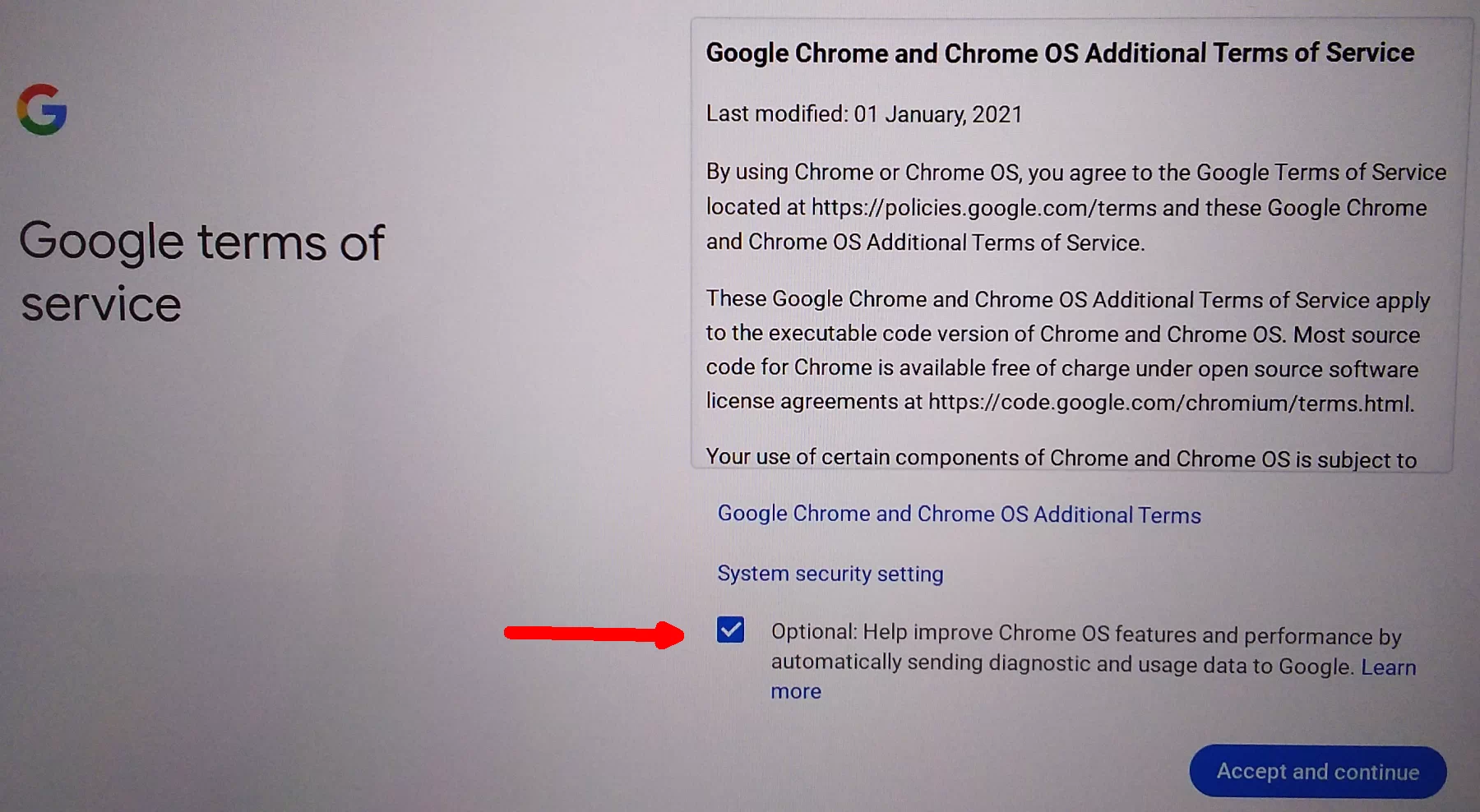 - There is a checkbox that says "Optional: Help improve Chrome OS features and performance by automatically sending diagnostic and usage data to Google."