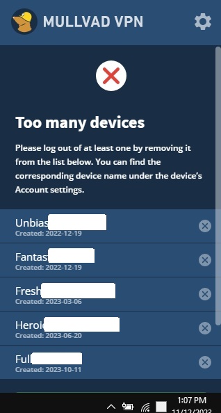 I suspect that having a limit on registered (again, my term) devices is a WireGuard thing as it says here that you can only have five Wireguard keys. What a key is, is apparently none of my business. Also, I have used Mullvad in the past and this was not an issue back when they used open source OpenVPN client software on mobile devices. If it is a WireGuard thing, then the Windows software should have asked if I wanted to use OpenVPN instead of de-registering (or whatever its called) another of my devices. It did not.