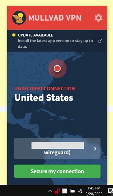 December 2022: The new user experience starts out great. Mullvad only knows you by an account number, you do not need to provide an email address to sign up. When you run their Windows software the first time, this is what you see. However, things go downhill very fast.