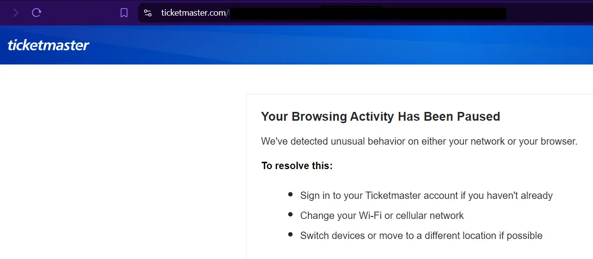 Sometimes a website will refuse to load when you are using a VPN. Making this worse, is that the error message, almost always, says nothing about a VPN. At tickets.com, for example,the error is "Access Denied". The US Postal Service, tells you that you do not have permission. Delta Airlines says "We're sorry but there was a problem processing your request. Please go back and try again. #SFAS001". At ticketmaster.com, the useless error message is "Your Browsing Activity Has Been Paused". They even include solutions that say nothing about blocking access from a VPN. Paying customers at Consumer Reports are falsely told that "This service is temporarily unavailable, please try again later."